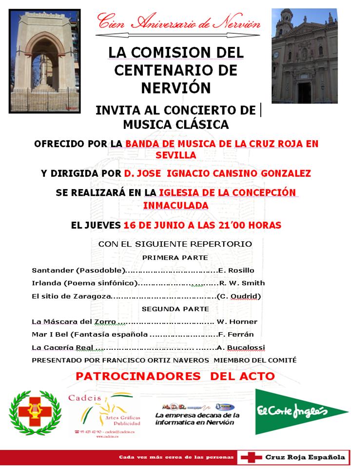 Este jueves día 16, con motivo del Centenario del Barrio de Nervión, tendrá lugar un Concierto de Música Clásica en la Parroquia de la Concepción Inmaculada a las 21:00 hora, a cargo de la Banda de Música de la Cruz Roja en Sevilla
