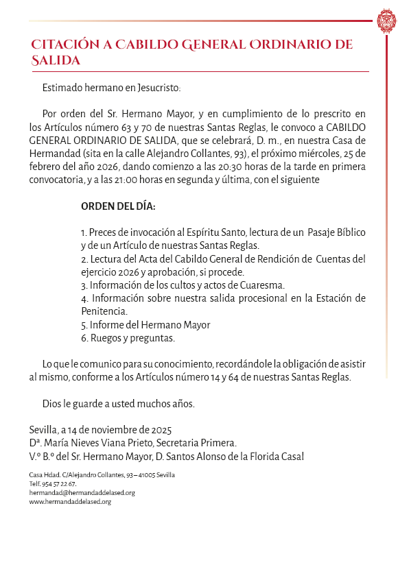 Por orden del Sr. Hermano Mayor, y en cumplimiento de lo prescrito en los Artículos número 63 y 70 de nuestras Santas Reglas, le convoco a CABILDO GENERAL ORDINARIO DE SALIDA, que se celebrará, D.m., en nuestra Casa de Hermandad (sita en la calle Alejandro Collantes, 93), el próximo miércoles, 25 de febrero del año 2026, dando comienzo a las 20:30 horas de la tarde en primera convocatoria, y a las 21:00 horas en segunda y última, con el siguiente: