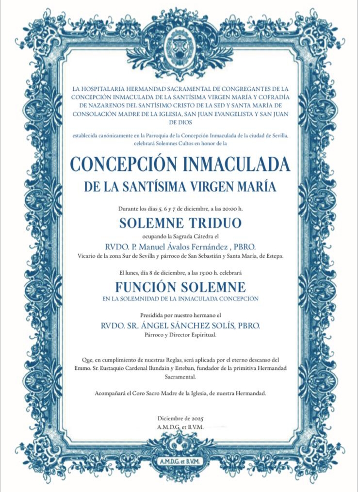 Los cultos comenzarán los días 5, 6 y 7 de diciembre, a las 20:00 horas, con el Solemne Triduo, cuya predicación estará a cargo del Rvdo. Sr. Manuel Ávalos Fernández, pbro., Vicario de la Zona Sur de Sevilla y párroco de San Sebastián y Santa María, de Estepa.