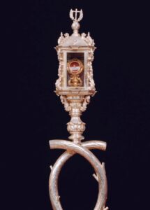 Como hemos comentado con anterioridad, la vinculación de la hermandad con la Orden Hospitalaria de San Juan de Dios se remonta a sus orígenes, habiendo visitado siempre la cofradía el antiguo sanatorio en su salida procesional. Tras el hermanamiento de ambas instituciones, la orden hizo entrega de una reliquia de su santo fundador (en concreto un fragmento de un hueso), realizando la hermandad un relicario con forma de báculo dentro del cual es procesionado cada Miércoles Santo desde el año 2002. La misma recuerda la forma del escudo de la orden, con dos ramas que se entrecruzan, a imagen del cayado que llevaba el santo. Fue realizado por Orfebrería Delgado López en el mencionado año 2002. Desfila rodeado por cuatro faroles realizados por el mismo taller al año siguiente.