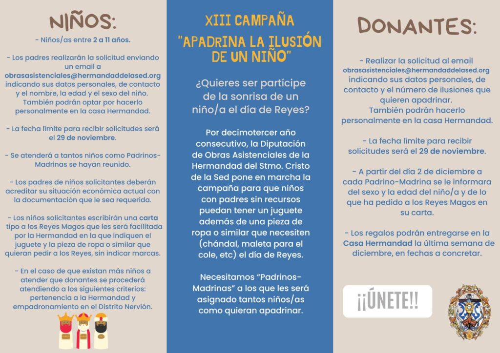 La Hermandad del Santísimo Cristo de la Sed pone en marcha un año más la Campaña Solidaria “Apadrina la Ilusión de un Niño”, que alcanza en esta ocasión su decimotercera edición, reafirmando el compromiso de la Hermandad de Nervión con las familias más vulnerables de nuestro entorno.