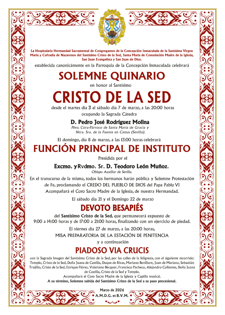 Del martes 3 al sábado 7 de marzo celebraremos en la Parroquia de la Concepción Inmaculada el Solemne Quinario a nuestro Venerado Titular, ocupando la Sagrada Cátedra D. Pedro José Rodríguez Molina, Pbro. Cura-Párroco de Santa María de Gracia y Ntra. Sra. de la Fuente en Camas (Sevilla). Dará comienzo cada día a las 20:00 horas.
